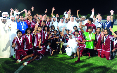 أحمد بن ناصر يتوسط لاعبي الوحدة خلال التتويج. من المصدر