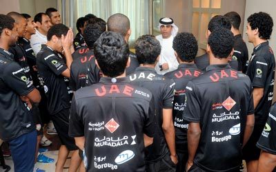 لاعبو منتخب الناشئين يتجمعون حول مهدي علي بعد المحاضرة. من المصدر