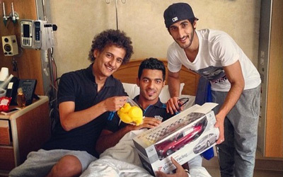 قام لاعبا العين سلطان الغافري ومحمد عبدالرحمن، بزيارة زميلهما يوسف أحمد، المهاجم الصاعد في نادي العين، في المستشفى، بعد تعرضه لإصابة في الركبة خلال مباراة عجمان في دوري الرديف، لكنْ ما لم يتوقعه أحمد، هديتان من نوع خاص، إذ قام الغافري و«عموري» بإهدائه لعبتين هما «بطة» و«سيارة» يتم التحكم بها عن بُعد.