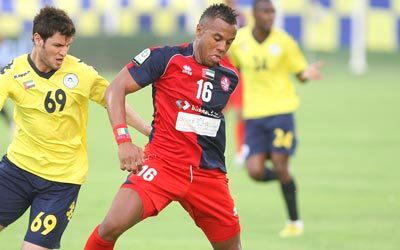 Michael Ndri of Al Shaab vs Anas Bani Yassen of Al Dhafra fight for the ball during match at the Etisalat Pro League in Al Al Dhafra. April 19, 2013. Photo by Erik Arazas