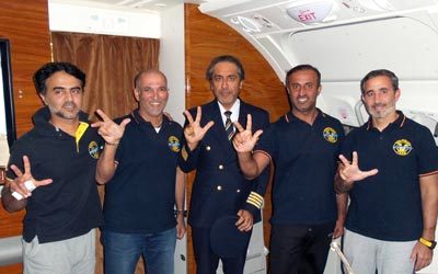 وقام قائد الطائرة عبدالله حمد بن غانم المري، وأفراد الطاقم بالترحيب بأبطال العالم على الرحلة وطائرة طيران الإمارات الإيرباص إيه 380، التي أقلت الوفد مع المسافرين إلى مطار دبي الدولي، إذ رحب المري بالبطلين عارف سيف الزفين ومحمد سيف المري وزميلهما البطل العالمي نادر بن هندي وأعضاء الوفدين الإداري والإعلامي.