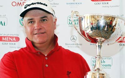 الويلزي ستيف دوود يرفع كأس بطولة أبوظبي «ستـيزين غولف». من المصدر