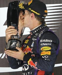 وكان سائق رد بل انتزع صدارة سباق ياس، أول من أمس، عند المنعطف الأول وحافظ عليها على مدار اللفات الـ55 لسباق أبوظبي، قاطعاً خط النهاية بفارق 30 ثانية عن زميله ويبر، على الرغم من انطلاقته من المركز الثاني خلف زميله في الفريق الأسترالي مارك ويبر، وتمكن فيتيل بهذا الفوز من كتابة فصل جديد في تاريخ الفورمولا1 بتمكنه من حصد ثلاثة ألقاب من أصل النسخ الخمس لسباق جائزة الاتحاد للطيران، فضلاً عن معادلة رقمه القياسي البالغ 11 فوزاً في موسم واحد، ومعادلة الرقم القياسي للأسطورة مايكل شوماخر عبر احرازه سبعة انتصارات متوالية.