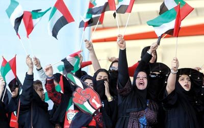 مشجعات المنـتخب يحتفلن بعلم الإمارات خلال منافسات «خليجي 21». تصوير: أسامة أبوغانم