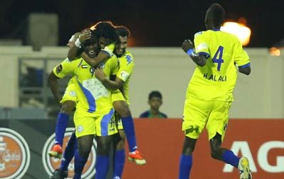 لاعبو الظفرة يحتفلون بالفوز الثمين على أرض الشعب. تصوير: مصطفى قاسمي