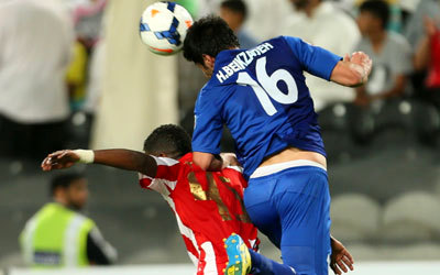 لاعب الجزيرة أحمد ربيع في صراع على الكرة مع لاعب الاستقلال هاشيم. أ.ف.ب