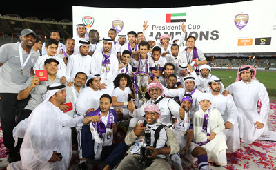 أسرة نادي العين تحتضن كأس رئيس الدولة بعد التغلب على الأهلي في مباراة مثيرة.