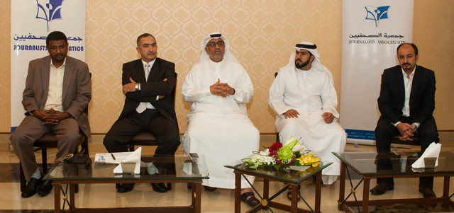 جانب من المتحدثين خلال ندوة جمعية الصحافيين حول تغطية المونديال إعلامياً. من المصدر