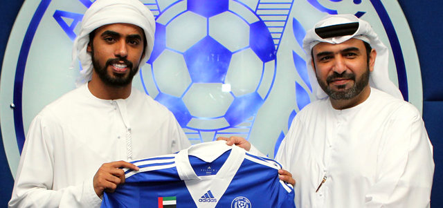 عبدالله قاسم يتسلم قميص النصر رقم 9 من المدير التنفيذي لشركة النصر عبدالله بوعميم. من المصدر