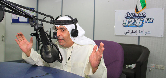 عبيد يوسف خلال التعليق على إحدى المباريات لمصلحة إذاعة وتلفزيون الفجيرة. الإمارات اليوم