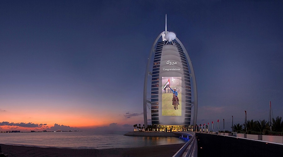 عرض برج العرب جميرا على شراعه صورة لسمو الشيخ حمدان بن محمد بن راشد آل مكتوم، ولي عهد دبي، حاملا علم الإمارات بعد تتويجه بالميدالية الذهبية لفئة الفردي وانتزاعه المركز الأول في سباق كأس العالم للقدرة في فرنسا بمشاركة 173 فارساً وفارسة يمثلون 47 دولة من مختلف أنحاء العالم.