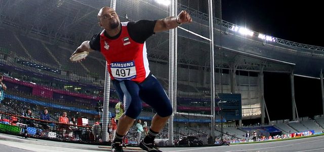 لاعب المنتخب الوطني لألعاب القوى صابـر سالم المهيري، يحاول الحصول على ميدالية في رمي القرص، خلال آسياد إنشيون. تصوير: عادل النعيمي