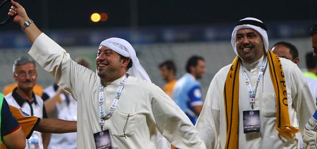 رئيس نادي القادسية طلال الفهد (يسار) وشقيقه خالد يحييان الجمهور بعد التتويج باللقب. أ.ف.ب