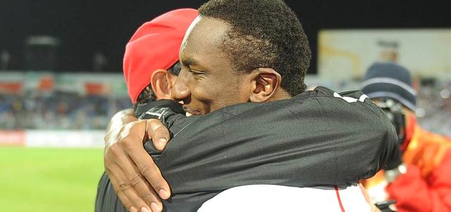 مهدي علي يعانق أحمد خليل بعد الفوز بلقب «خليجي 21» أمام العراق. تصوير: أسامة أبوغانم