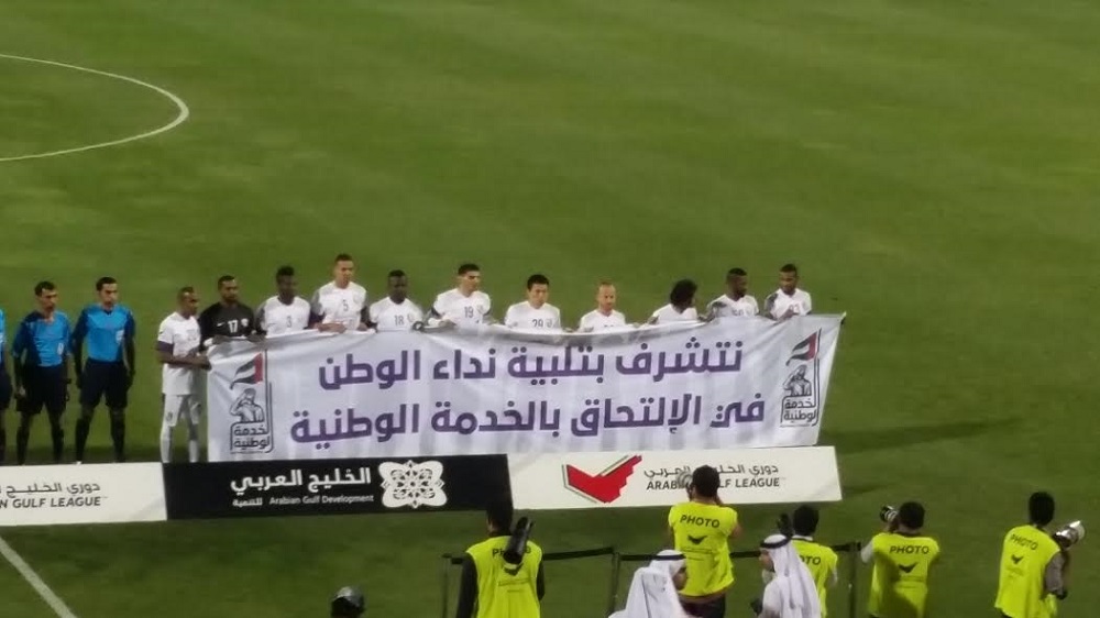 رفع لاعبوا فريق العين لكرة القدم لافته قبل انطلاق مباراتهم مع فريق الشباب في الجولة الأولى المؤجلة من دوري الخليج العربي، كتب عليها "نتشرف بتلبية نداء الوطن في الالتحاق بالخدمة الوطنية"، وكان عدد من لاعبي العين قد نشروا صوراً خاصاً على مواقع التواصل الاجتماعي اثناء توجهم للتسجيل في الخدمة الوطنية وتلبية نداء الوطن، في اشارة منهم لالتحاق عدداً منهم بعد المباراة وتوقف الدوري في ختام الدور الأول من بطولة دوري الخليج العربي.