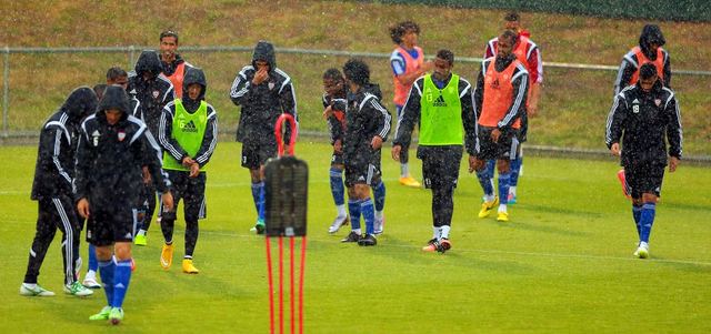 الأبيض يتدرب تحت المطر لمواجهة قطر في «أمم آسيا»