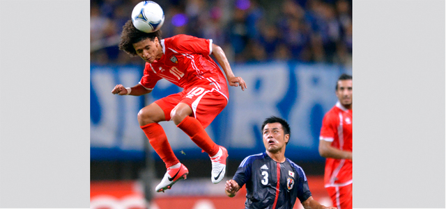 «عموري» في لقطة هوائية أمام اليابان خلال مباراة ودية عام 2012. أ.ف.ب
