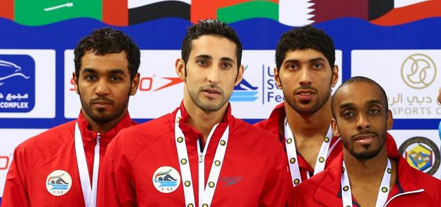 سباحو الإمارات خلال التتويج في البطولة. تصوير: أحمد عرديتي