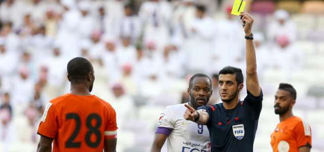 الحكم سلطان المرزوقي يشهر البطاقة الصفراء للاعب عجمان بوريس كابي. تصوير: إريك أرازاس