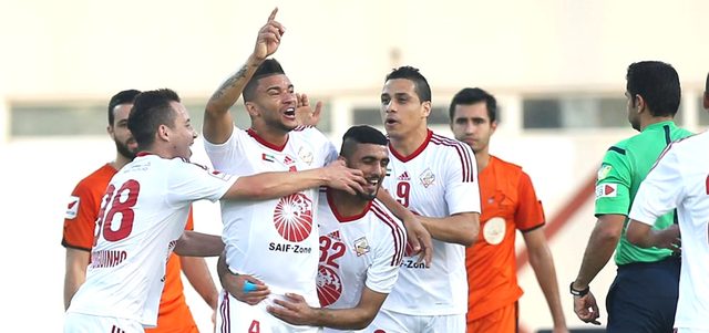 نجوم الشارقة يحتفلون بالفوز العريض على عجمان. تصوير: أسامة أبوغانم