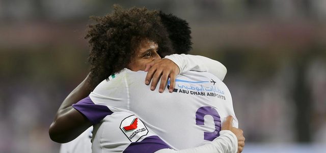 «عموري» وجيان يتعانقان بعد قيادتهما العين للفوز على الجزيرة في إياب دوري الخليج العربي. تصوير: إريك أرازاس