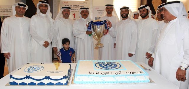 احتفلت دائرة الأراضي والأملاك في دبي وكل العاملين في المؤسسة بإنجاز فريق النصر بالفوز بلقب كأس رئيس الدولة بكرة القدم، وذلك في زيارة رسمية من مجلس إدارة النادي برئاسة مروان بن غليطة، إلى مقر الدائرة وقام مدير عام دائرة الأراضي والأملاك سلطان بن مجرن، بتقطيع كعك الاحتفال الذي اعد خصيصاً لهذه المناسبة في حضور الكأس التي حرص كل العاملين على التقاط صور تذكارية معها. وشكر رئيس مجلس إدارة نادي النصر مروان بن غليطة، دائرة الأراضي والأملاك على هذه المبادرة، وأكد أنها ليست غريبة على الدوائر والمؤسسات الحكومية العاملة في دولة الإمارات احتفالاً بإنجاز العميد الذي طال انتظاره، مشيراً إلى مدى الترابط الذي يربط بين مؤسسات الدولة والأندية الموجودة في الإمارة، إذ إن هذه المؤسسات هي الداعم الرئيس للعديد من الأندية.