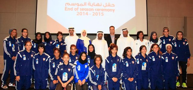نظمت لجنة كرة القدم للسيدات باتحاد كرة القدم، أول من أمس، بفندق سانت ريجينسي بجزيرة السعديات في العاصمة أبوظبي، احتفالاً بختام موسم 2014 - 2015 ، بحضور نائب رئيس اتحاد الكرة، عبيد سالم الشامسي، وعضوي مجلس الإدارة، أمل بوشلاخ وسعيد الطنيجي، والأمين العام بالوكالة، محمد عبدالله هزام الظاهري، وأعضاء لجنة كرة القدم للسيدات، مسلم أحمد وعلياء الحوسني وندى الهاشمي، وممثلي شركة الاستثمارات البترولية الدولية (آيبيك) والهيئة العامة للشباب والرياضة، بالإضافة إلى لاعبات الفرق المشاركة في مسابقات دوري الفتيات (تحت 14 سنة) والناشئات (16 عاماً) والدرجة الأولى.