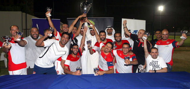 فريق «الإمارات اليوم» يرفع كأس جمعية الصحافيين وسط فرحة عارمة. تصوير: أسامة أبوغانم