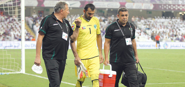 حارس مرمى الصقور أحمد الشاجي في لقاء سابق. الإمارات اليوم
