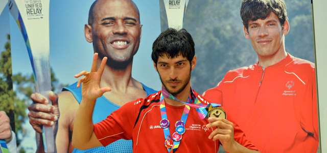 عبدالله التاجر يستعرض الميدالية الذهبية بعد الفوز بسباق 50 متر سباحة حرة. من المصدر