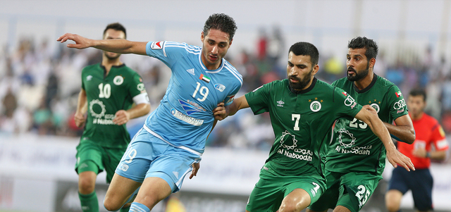 لاعب الشباب حيدروف «يمين» يحاول منع لاعب بني ياس إسحاق بالفوضيل من الانطلاق بالكرة. تصوير: إريك أرازاس