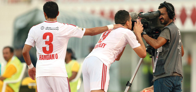 حمدان قاسم يحتفل مع زميله فاندرلي بالفوز على دبا الفجيرة. تصوير: أسامة أبوغانم