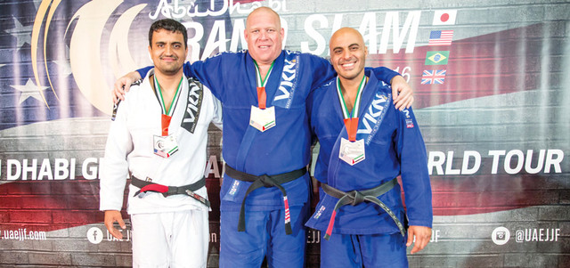 طارق القاسمي على منصة التتويج بالمركز الثالث في جائزة أبوظبي غراند للجوجيتسو. من المصدر