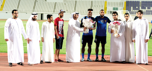 عدد من أنصار العين يقدمون باقة ورود تقديراً لأمنيكي وبابل. من المصدر