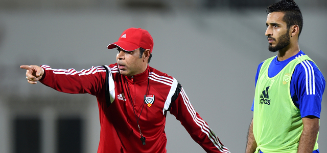 مهدي علي يوجه مبخوت خلال تدريبات المنتخب الوطني. الإمارات اليوم