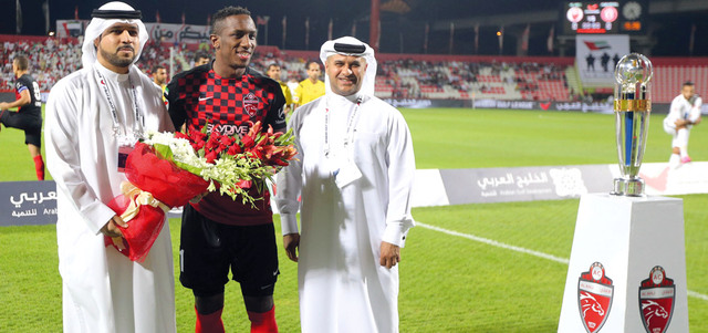 أحمد خليل يحتفل بجائزة أفضل لاعب آسيوي خلال مباراة الأهلي والجزيرة أول من أمس. تصوير: مصطفى قاسمي
