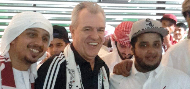 مشجعو الوحدة التقطوا صوراً تذكارية مع أغيري عقب مباراة الظفرة. الإمارات اليوم