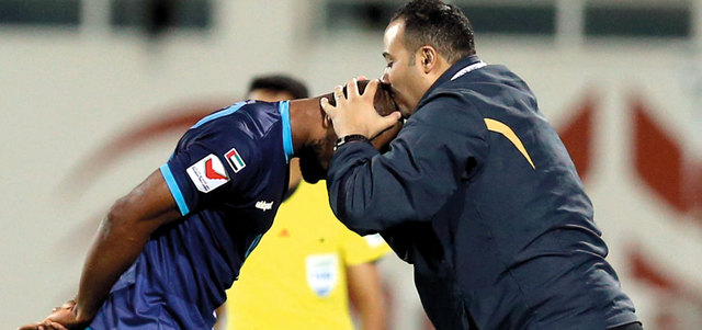 مساعد مدرب دبا الفجيرة المصري طارق السيد يقبّل رأس المحترف العاجي بوريس كابي نجم المباراة بعد تسجيله الهدف الثالث. تصوير: أسامة أبوغانم