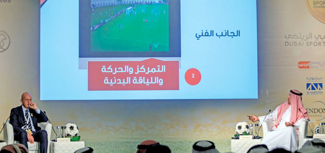 جلسة «التحكيم في كرة القدم» حظيت باهتمام الحضور في مؤتمر دبي بحضور الحكمين الموندياليين السابقين كولينا وعلي بوجسيم. تصوير: باتريك كاستيلو