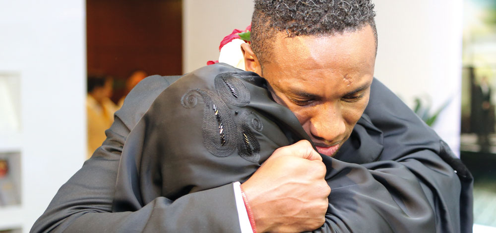 نجم المنتخب الوطني والأهلي، أحمد خليل، يعانق والدته لدى وصوله مطار دبي عائداً من كوالالمبور متوجاً بجائزة أفضل لاعب في آسيا 2015.
