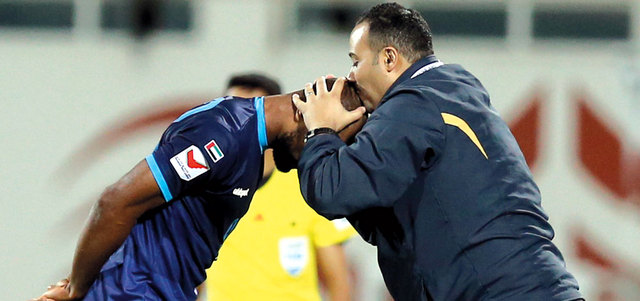 مساعد مدرب دبا الفجيرة المصري طارق السيد يقبّل رأس المحترف العاجي بوريس كابي. تصوير: أسامة أبوغانم