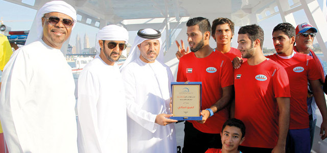 وتسلم نوخذة وطاقم القارب الدرع التكريمية من رئيس قسم الإنقاذ البحري في الإدارة العامة للنقل والإنقاذ بشرطة دبي، الرائد علي عبدالله القصيب النقبي، بحضور عضوي مجلس إدارة نادي دبي الدولي للرياضات البحرية عيسي خلفان بن خرباش، وخالد بن دسمال.