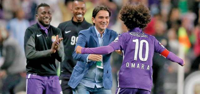 مدرب العين زلاتكو يهنئ البديل عموري بعد تسجيله هدف الفوز الثمين. تصوير: إريك أرازاس