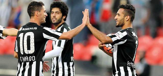 علي مبخوت وتياغو يتبادلان التهنئة بعد الفوز على دبا 5-1 في الجولة 17 من الدوري. تصوير: إريك أرازاس