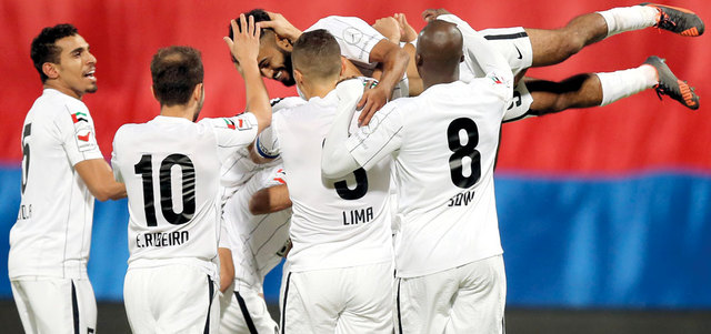 محمد الخوري محمولاً من لاعبي الأهلي بعد تسجيله هدفاً في الشعب. تصوير: أسامة أبوغانم