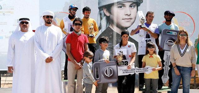 محمد وفاطمة وحمدان بن منصور بن زايد آل نهيان توجوا الفائزين بالسباق. تصوير: نجيب محمد