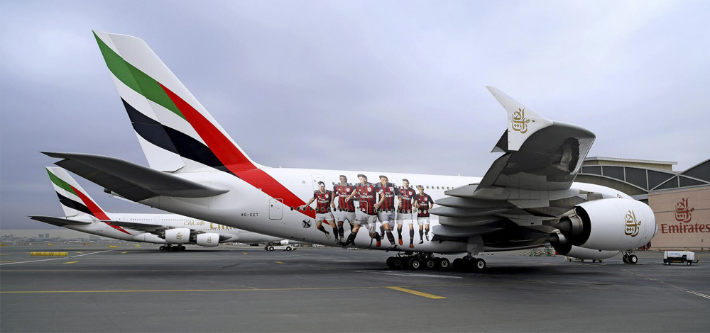 احتفلت طيران الإمارات وفريق "إيه سي ميلان" بشراكتهما بكشف النقاب عن ملصق ضخم يصور لاعبي الفريق على إحدى طائرات الإمارات الإيرباص A380 التي تعمل على خط دبي- ميلانو- نيويورك.