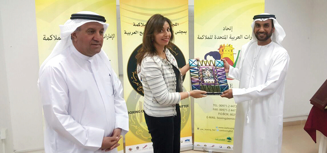 كرّم رئيس الاتحاد الإماراتي للملاكمة رئيس اللجنة التنظيمية لدول مجلس التعاون الخليجي بالملاكمة، الشيخ حامد بن خادم آل حامد، رئيسة لجنة الملاكمة بالاتحاد البحريني للدفاع عن النفس، سهى مطر، على هامش دورة مدربي الملاكمة المستجدين التي نظمها اتحاد الإمارات للعبة. وكانت البحرين قد أشهرت أخيراً بشكل رسمي لجنة الملاكمة التابعة لاتحاد رياضة الدفاع عن النفس البحريني. محمد فاضل ـــ دبي