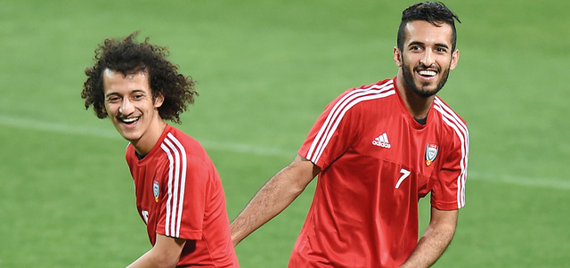 علي مبخوت (يمين) ومحمد عبدالرحمن خلال تدريب المنتخب. من المصدر