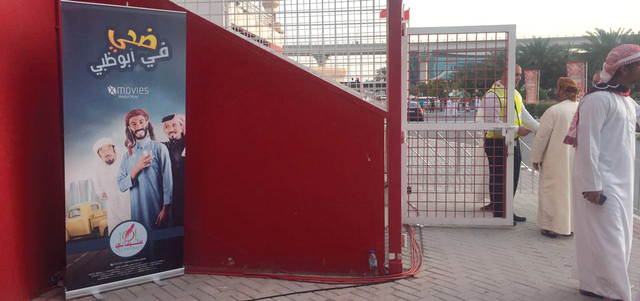 لوحة دعائية لفيلم «ضحي في أبوظبي» في استاد راشد. الإمارات اليوم